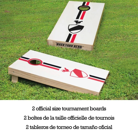 Our professional tournament sized boards are heavy duty, fun to play, and made to withstand countless games. We use premium hand crafted New Zealand pine wood in the frame and legs for increased strength and durability. The playfield or surface area is made of a thick multilayered plywood, coated with a protective lacquered finish. The professional grade all weather “stick and slide” bags are double stitched and burst resistant. Let the games begin!